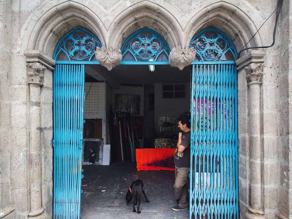 Su arquitectura gótica le dotaba de características únicas al taller de Celi. La altura por ejemplo permitía un local con un pequeño altillo, que el artista usa como bodega y sitio de descanso, y unas ventanas altas permiten el ingreso del luz y le proveen una sensación de amplitud.